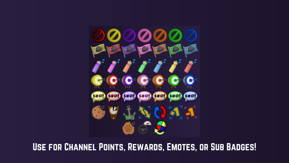 I've created over 100 different designs for you to use for your Channel Point Icon and Channel Rewards! These designs also make for great extra Emotes for your channel! I've also included resized versions of these designs to use for Sub Badges if you want as well.